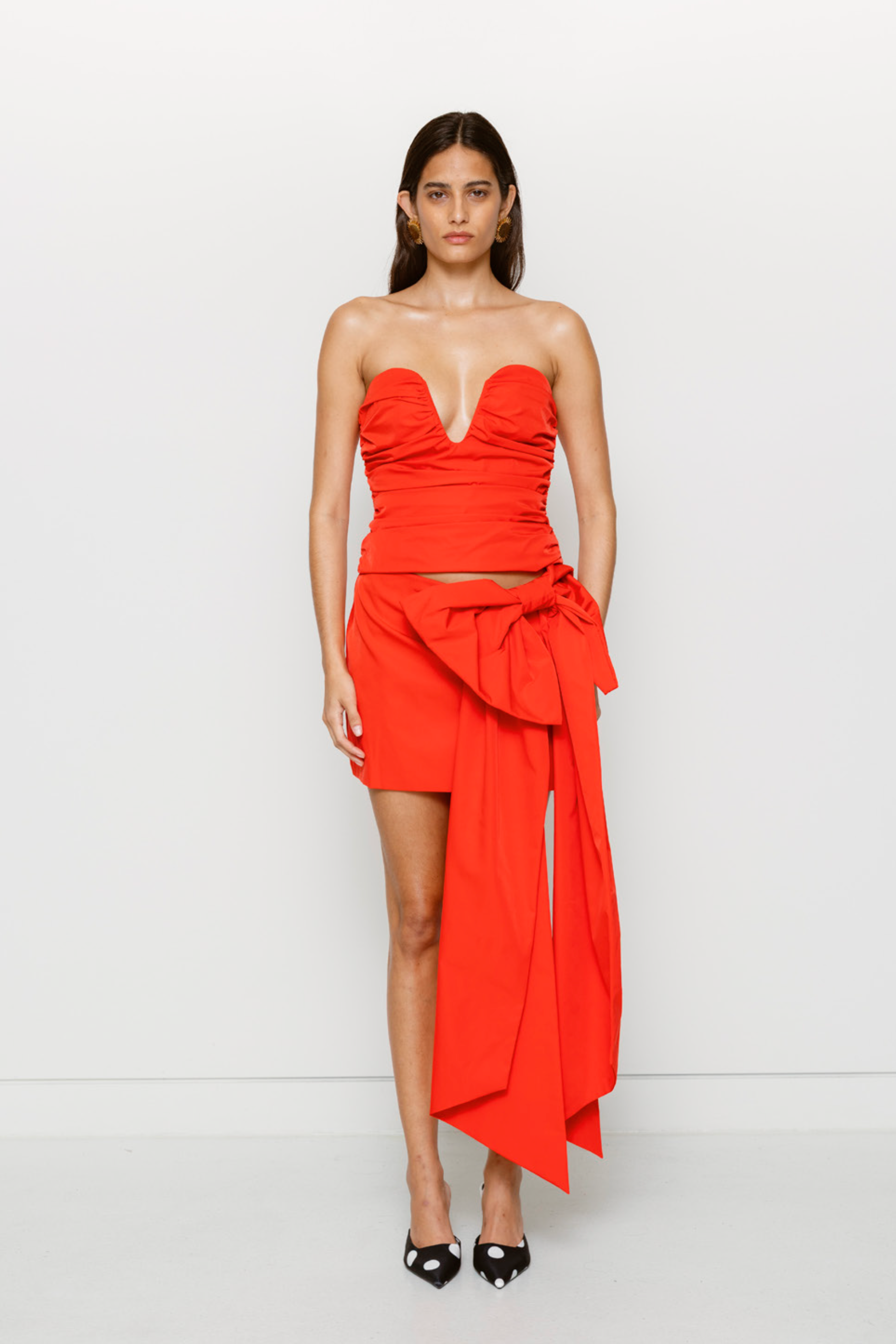 A playful mini skirt that makes a bold entrance with its statement oversized bow at the waist. Featuring a convenient zipper closure and a cheeky length that's ready for anything, from brunch to night out. The Luella Skirt in Cherry is your go-to piece for adding personality to any outfit.